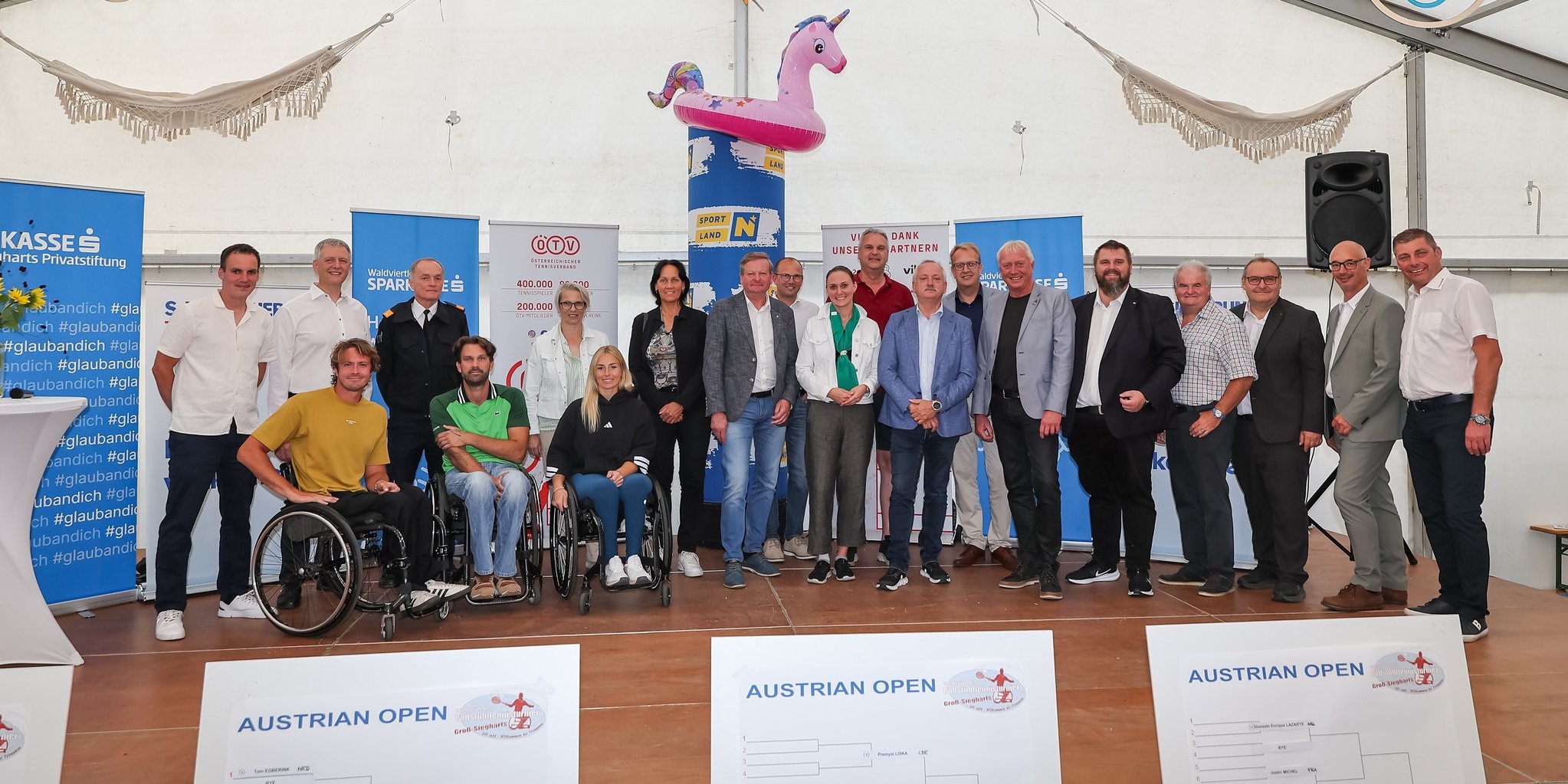 „Im Rahmen des Ehrenempfangs freut es mich sehr, Sie heute hier bei den 36. s Versicherung Austrian Open in Groß-Siegharts willkommen heißen zu dürfen. Ein herzliches Dankeschön an Landeshauptfrau Johanna Mikl-Leitner, die uns ihre Grußworte übermittelt hat und damit ihre Unterstützung für dieses großartige Turnier zum Ausdruck bringt“: Bei der Eröffnungszeremonie begrüßten Turnierdirektorin Viola Lugmayr und Turnierdirektor Philipp Dörre sowie der Obmann von Rollstuhltennis Austria, Michael Schelm, zahlreiche Ehrengäste, darunter Gottfried Waldhäusl (Zweiter Präsident des NÖ Landtags), Viktoria Hutter (Bundesrätin, in Vertretung von Landeshauptfrau Johanna Mikl-Leitner, Michael Bierbach (Landtagsabgeordneter, in Vertretung von Vizekanzler Andreas Babler), Mag. Manuela Herzog (Bezirkshauptfrau Waidhofen/Thaya), Petra Schwarz (NÖTV-Präsidentin), Alois Maurer (Landesdirektor des Hauptsponsors s Versicherung). Darüber hinaus waren viele weitere Ehrengäste aus Politik, Sport, Wirtschaft und NGOs anwesend.