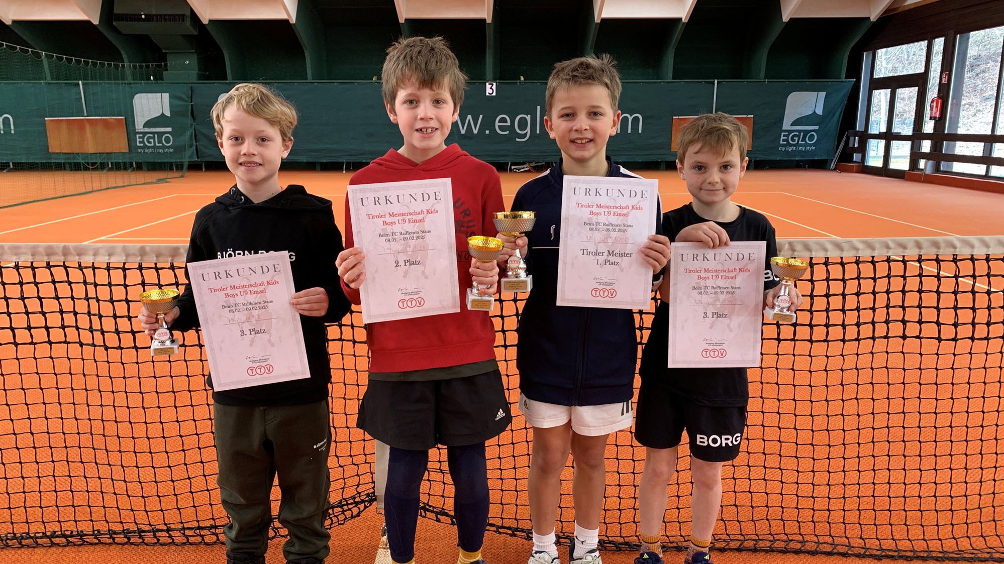 Knapp 90 Kinder und Jugendliche kamen in den Semesterferien im Tenniscenter Stans zusammen, um ihre TTV-Hallenmeister 2025 in acht Altersklassen zu ermitteln. Bei den U8-Boys setzte sich Raphael Wolf (TC Raika Pitztal) durch, bei den U9-Girls Magdalena Söllner (TC Ebbs), bei den U9- und den U10-Boys jeweils Jakob Kostenzer (TC Wattens) und bei den U10-Girls Jasmin Schmidt (USV Ötz). In der U11 gewann Ida Mauracher (TC Terfens-Vomperbach) bei den Mädchen, Nils Randolf (TC Raika Pitztal) bei den Burschen.