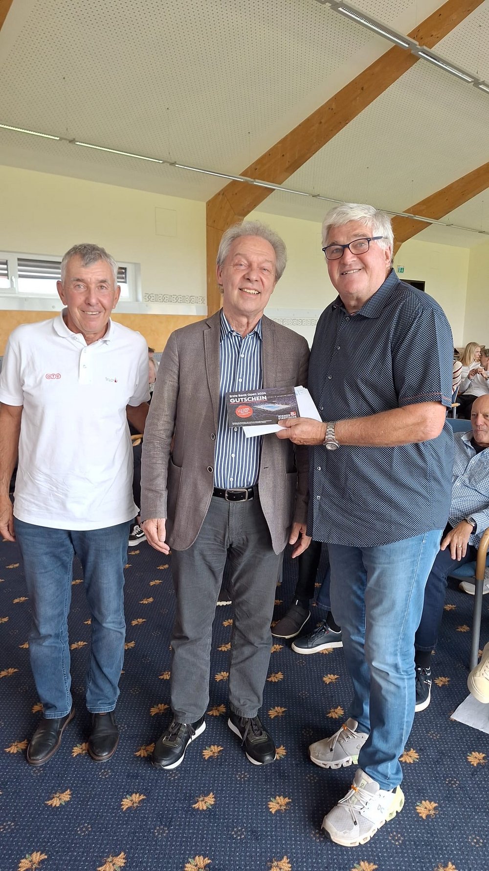 Herbert Riederer (links) und Helmut Köck (rechts) vom Senioren-Bundesliga-Wettspielausschuss überreichten nach der Verlosung Johann Buzanich (Mitte) vom First Vienna Football-Club 1894 die Eintrittskarten für das Finale der Erste Bank Open in der Wiener Stadthalle.